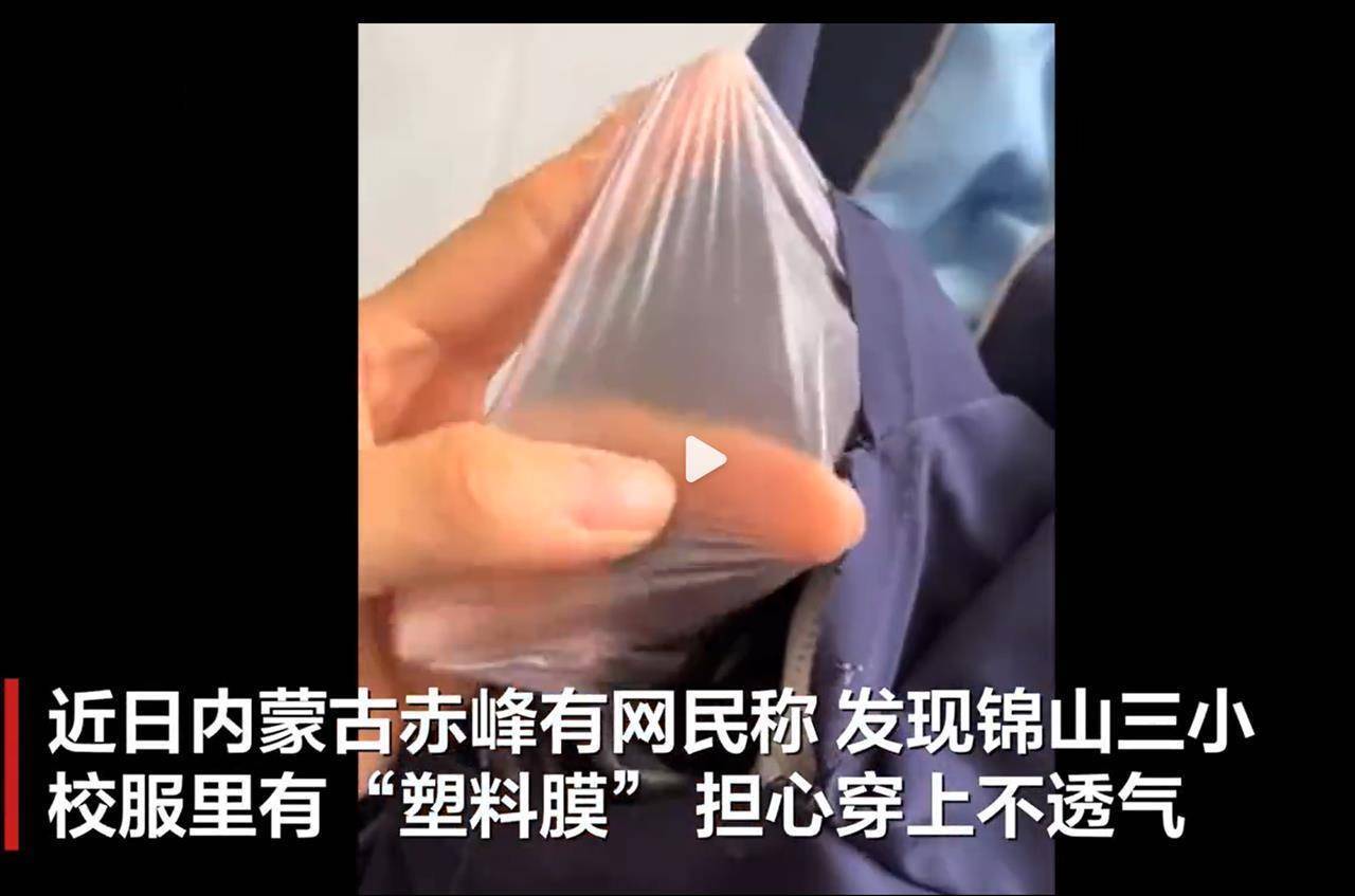 视频显示,学生家长在一件深、浅蓝色相间的衣物破损处,扯出一片透明的塑料薄膜,薄膜用手指一捅便破。视频发布者称,这是喀喇沁旗锦山三小的校服,并表示“这校服质量也是没谁了,孩子穿着运动能透气吗?”但也有网友揣测,薄膜可能是为了防风保暖。(据1月10日新京报)