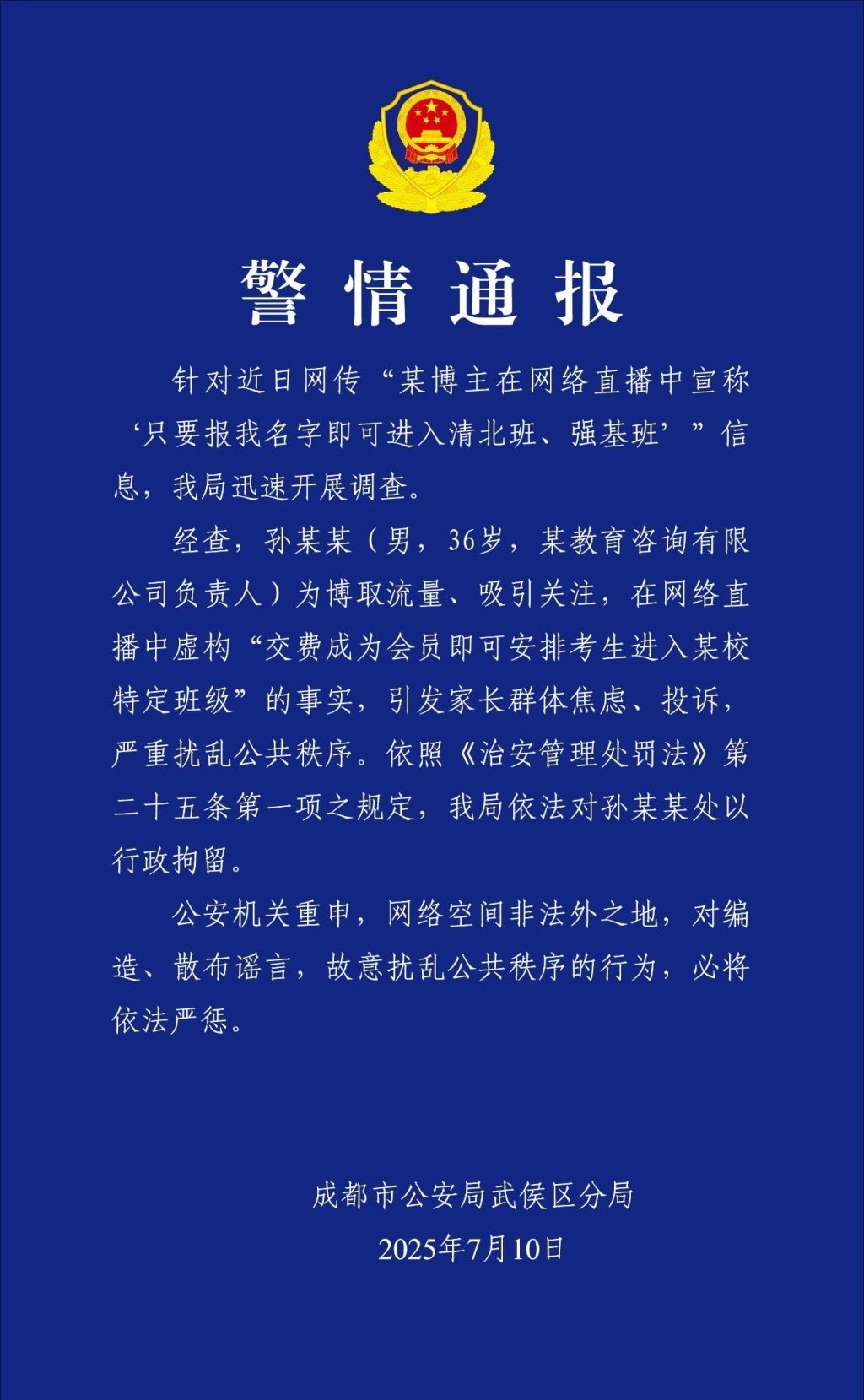 7月10日,成都市公安局武侯区分局发布警情通报称,针对近日网传“某博主在网络直播中宣称‘只要报我名字即可进入清北班、强基班’”信息鼎东策略,公安局迅速开展调查。