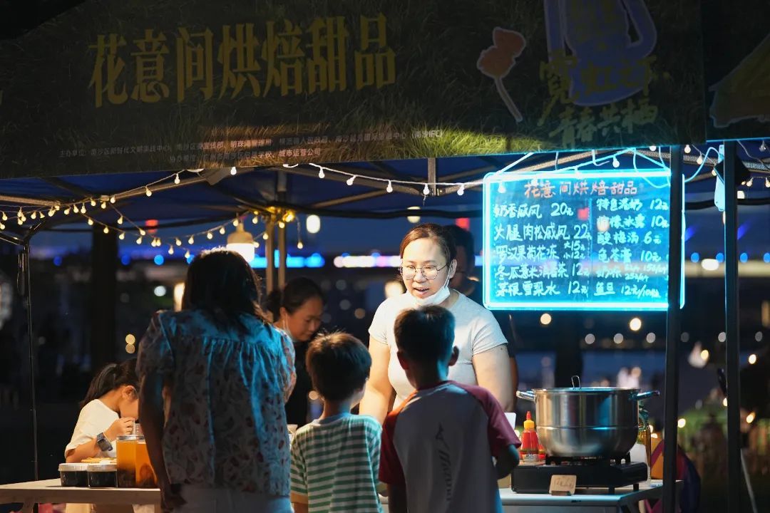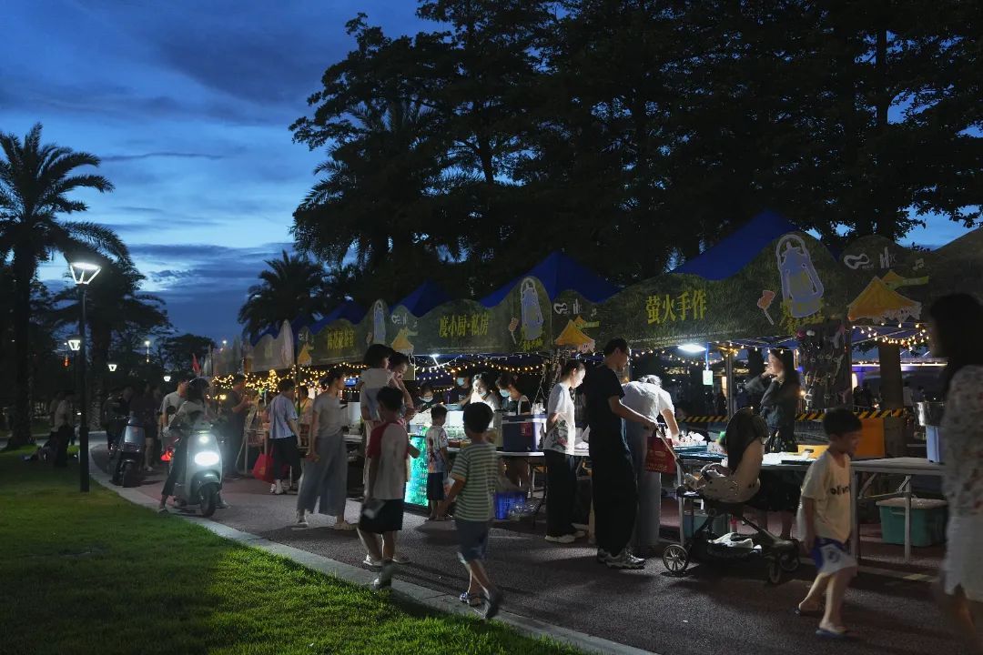 现场,人们或围坐在天幕之下,或拾阶而坐,一边分享美食,一边笑谈生活点滴。竹盐吊烧鸡、庙贝社区编织篮仔……汇聚20多个特色摊位的创意市集更是烟火气十足。横沥本土美食的香气弥漫在空气中,挑动着人们的味蕾;启慧学校孩子们的手作文创作品,每一件都凝结着纯真与巧思,引得不少游客驻足欣赏、购买。